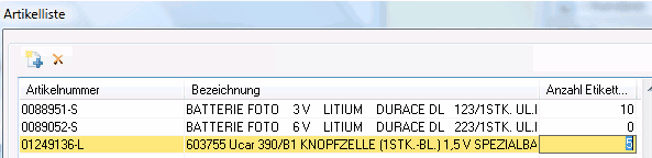 Wenn Sie den gewünschten Artikel in die Liste übernommen haben können Sie noch die Anzahl der zu druckenden Etiketten angeben: