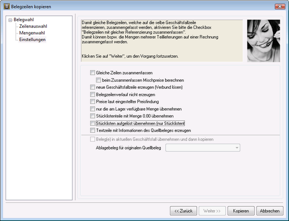 Mit der Option clip0184 werden gleich alle Zeilen des Quellbelegs kopiert, ist diese Einstellung nicht aktiv, so kommt im nächsten Schritt des Assistenten eine Auswahl der zu kopierenden Belegzeilen. Wenn mehrere Belege auf einmal kopiert werden ist diese Einstellung automatisch aktiv. Nicht benötigte Zeilen müssen dann ggf. aus dem Zielbeleg manuell gelöscht werden.
