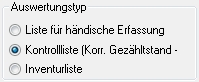 Weiters können Sie zum Vergleich zwischen den Gezähltbeständen und den aktuellen Istbeständen noch eine Kontrollliste ausdrucken, in dem Sie den Menüpunkt Listen > Inventurliste drucken wählen und bei Auswertungstyp die Kontrollliste auswählen: