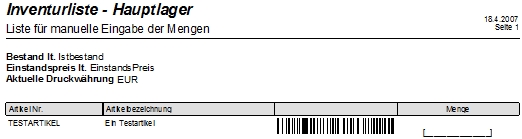 Um das Zählen der Artikel im Lager zu erleichtern kann man sich aus der Lagererfassung eine Liste aller im betroffenen Lager aktiven Artikel (inkl. Barcode) ausdrucken.