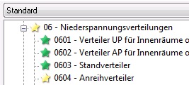 Kontrolle der aktuellen Herstellerpräferenzen: Wenn sie bereits früher Herstellerpräferenzen definiert haben, dann sollten Sie kontrollieren, ob diese Präferenzen für das aktuelle LV gewünscht sind. Welche Leistungsgruppen Sie bereits (früher) bearbeitet haben erkennen Sie an der Farbe des Sternchens links neben der jeweiligen Gruppe (grün = Original; gelb = von Ihnen bereits einmal verändert; rosa = billigste Stückliste).