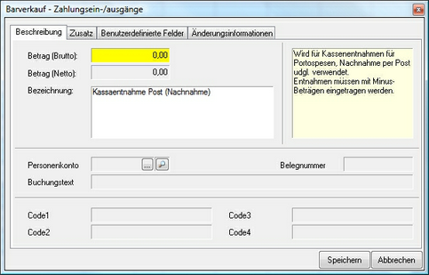 Die Kassaentnahme Post dient zum Eintragen von erlösunwirksamen Entnahmen, die wie Zahlungen einer Eingangsrechnung verbucht werden.