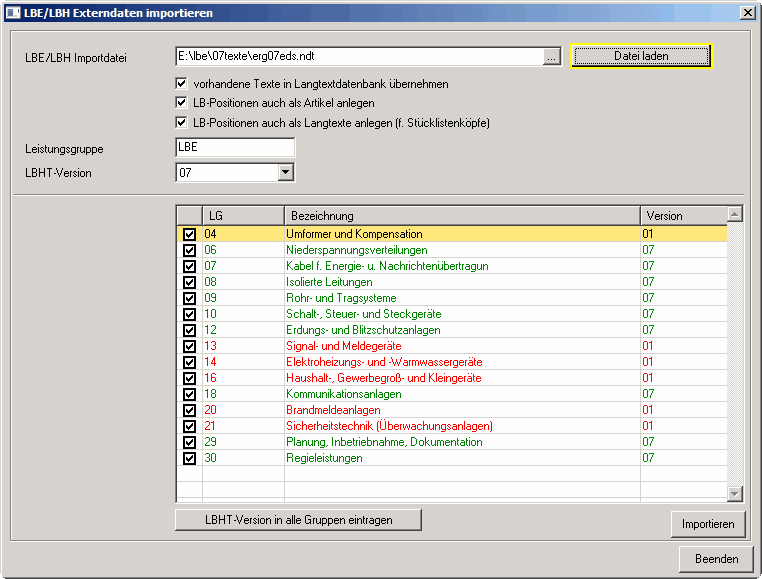Je nach der LB-Version, mit der Sie arbeiten wollen müssen Sie auch die dazupassende Datei einlesen. Es ist durchaus üblich, mehrere Versionen parallel einzuspielen da Sie ja von den verschiedensten Planern auch Ausschreibungen mit verschiedenen LB-Versionen bekommen können - derzeit sind die LB-Versionen 06 und 07 gebräuchlich, seit Herbst 2009 gibt es die Version 08. Allerdings werden die dazu passenden Stücklisten der verschiedenen Anbieter (EDS, Schäcke, Regro, ..) erst ca. ab November 2010 zur Verfügung stehen (Stand Juni 2010).