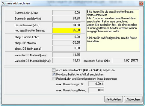 Die Funktion „Summe rückrechnen“ verändert nur den Materialwert (VKN) Der Lohnbetrag bleibt unverändert.