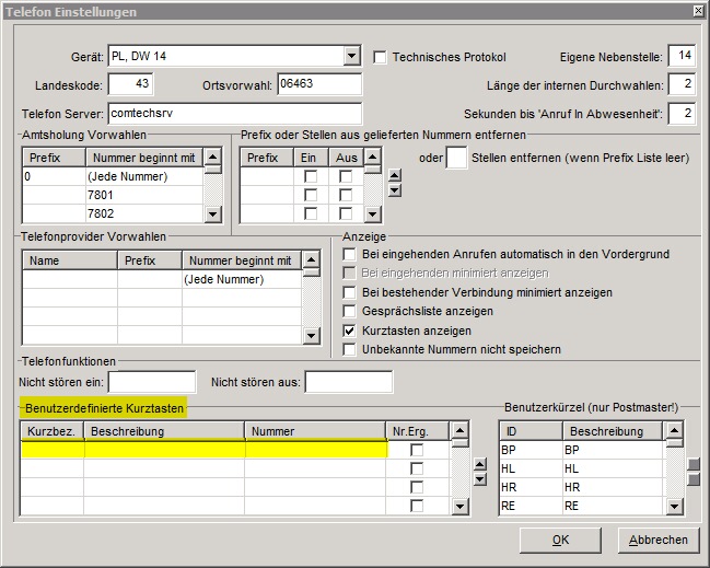 Hinweis:Sie sollten sich vorher mit dem technischen Kundendienst von Comtech in Verbindung setzen und diese Einträge ev. über die Fernwartung gemeinsam machen, falls das nicht ohnedies schon bei der technischen Installation vor Ort geschehen ist.