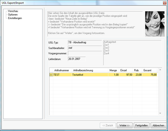 Es kann jeder beliebige Belegtyp per UGL ausgegeben werden, genauso können vom Großhändler empfangene UGL Daten in jeden Belegtyp importiert werden. Sinnvoll sind aber vor allem Angebot, Auftrag und Bestellung/Wareneingang.