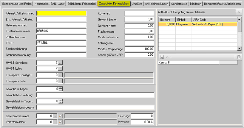 Lieferantennummer: wenn Sie mit dem Bestellsystem arbeiten, müssen Sie hier unbedingt die entsprechende Lieferantennummer (aus dem Lieferantenstamm) eintragen !! Bei einer automatischen Preiswartung wird der Lieferant automatisch eingetragen, bei selbst angelegten Artikeln müssen Sie zuerst den entsprechenden Lieferanten anlegen und dann hier eintragen.