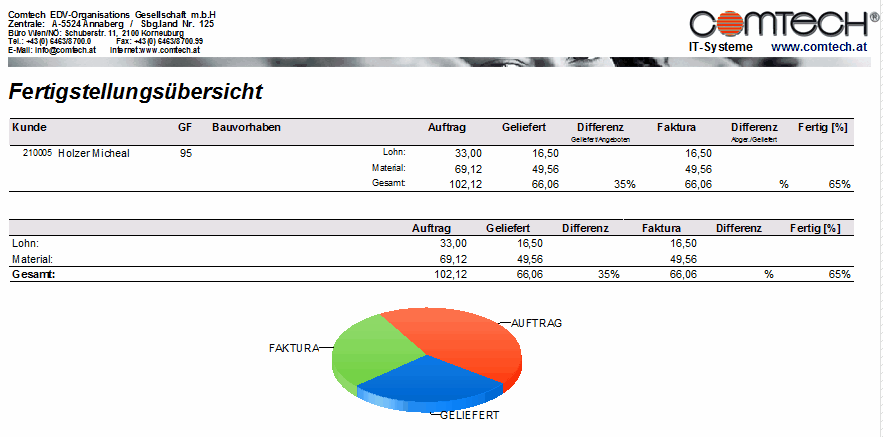 Beispiel für eine Fertigstellungsübersicht eines einzelnen Geschäftsfalles: