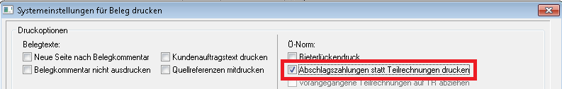 Damit die Abschlagszahlungen gedruckt werden unter Drucken – Systemeinstellung Hakerl bei „vorangegangene Teilrechnung auf Teilrechnung abziehen“ herausnehmen und bei „Abschlagszahlung statt Teilrechnung drucken“ setzen. Diese Druckvariante ist dann für die Teil- und Schlussrechnung anzuwenden.