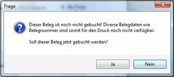 Sollte ein Beleg vor dem Druck noch nicht gebucht worden sein, dann erhalten Sie folgende Frage: