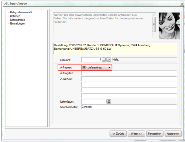 Im Abschnitt Optionen muss bei der Anfrageart BE – Lieferauftrag gewählt werden! Ansonsten kann die Bestellung von Miele nicht verarbeitet werden!