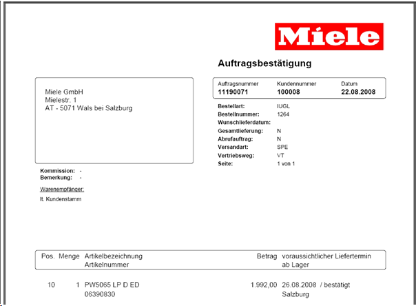 Nach Erfassung der Bestellung im Miele System erhalten Sie eine Auftragsbestätigung per Mail: