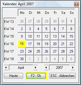 Button OK oder F2: Das ausgewählte Datum wird in jenes Feld übernommen/eingefügt, von dem aus der Kalender gestartet wurde.