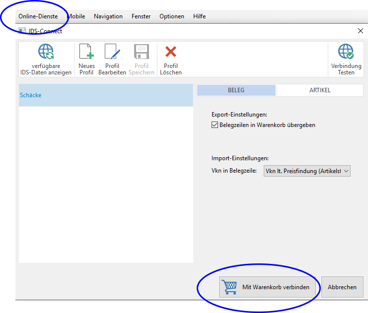 Beleg in der Comeconomy öffnen und in die Artikelnummer klicken - Online Dienste - IDS Connect auswählen: Beleg Bestellung, es wird im IDS-Connect Fenster, automatisch das Profil vom Goßhändler ausgewählt aufgrund der Lieferantennummer im Belegkopf. Bei allen anderen Belegen (z.B. AGBT) ist das Großhändler-Profil manuell auszuwählen.