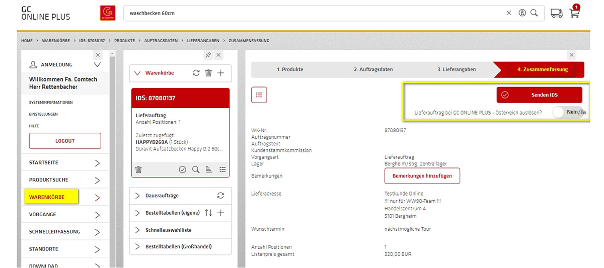 GC-Gruppe (Steiner und Odörfer) Die IDS-Funktionen findet man im Warenkorb im Register "Zusammenfassung"