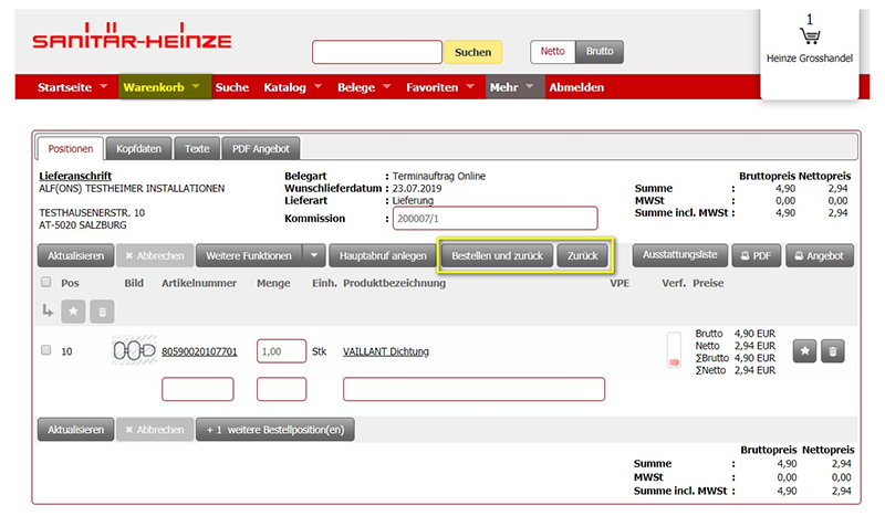 Heinze Man übergibt die Artikel vom Beleg und/oder sucht sich im Webshop weitere Artikel aus, im Warenkorb Zurück: Artikel werden in den Beleg übernommen, ohne Bestellung (die Artikel bleiben im Warenkorb liegen - manuell rauslöschen unter weitere Funktionen "Warenkorb leeren") Bestellen und Zurück: es wird direkt die Bestellung ausgelöst und die Artikel werden in den Beleg übernommen