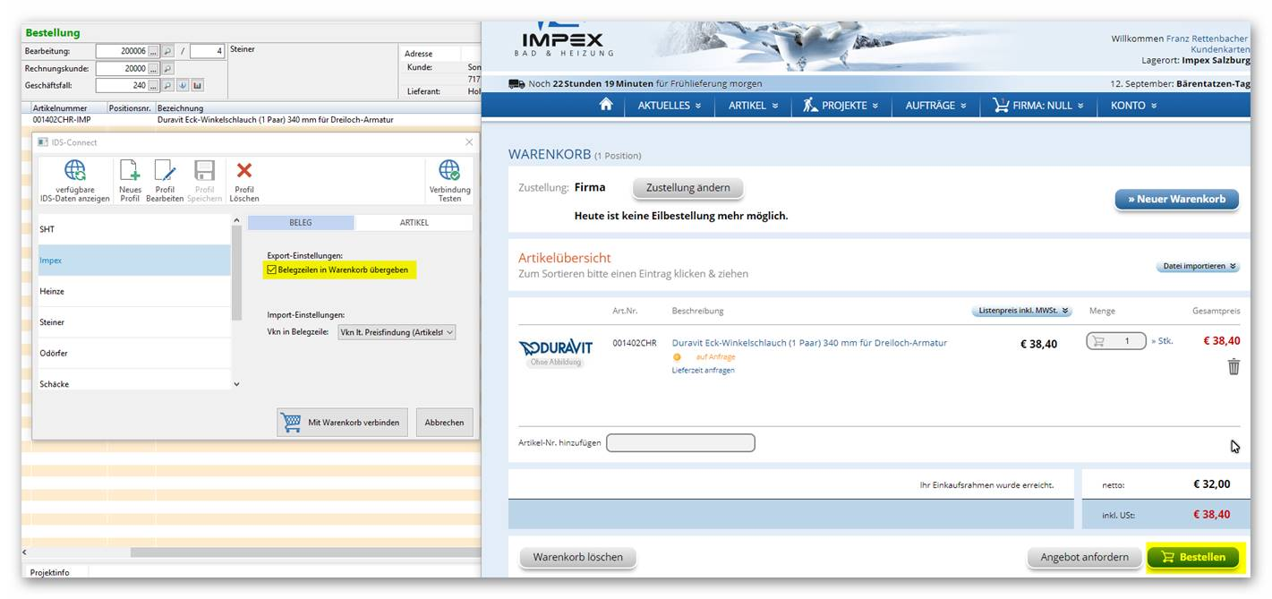 Impex Artikel werden im Beleg erfasst und an den Webshop übergeben - eventuell noch geändert oder ergänzt - "Bestellen" -> Artikel werden bestellt, aber nicht in den Beleg übernommen