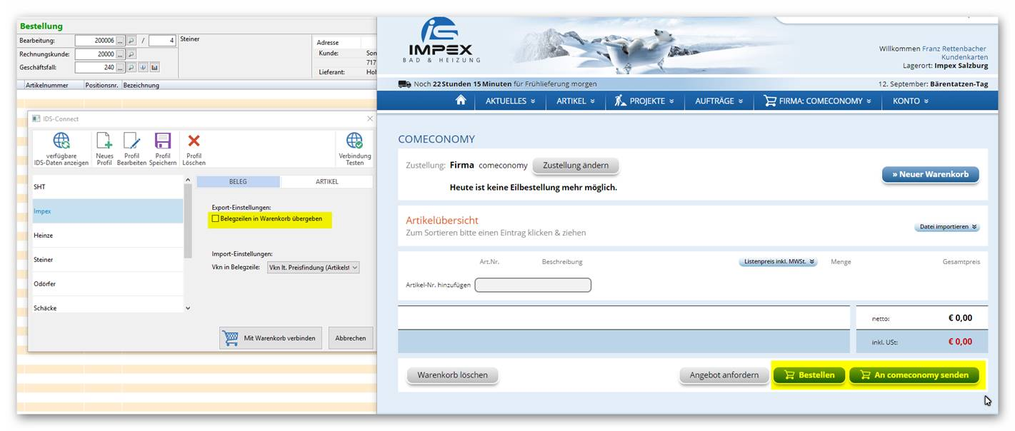 Artikel erst im Webshop erfassen durch Aufruf der IDS-Schnittstelle aus einem leeren Beleg oder ohne Hakerl "Artikel an Warenkorb übergeben" - "Bestellen" -> Artikel werden bestellt, aber nicht in den Beleg übernommen - "An comeconomy senden" -> Artikel werden in den Beleg übernommen, ohne Bestellung