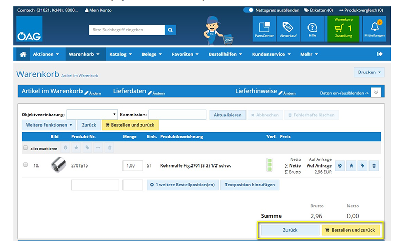 ÖAG Man übergibt die Artikel vom Beleg und/oder sucht sich im Webshop weitere Artikel aus und fügt diese zum Warenkorb hinzu -> Wechsel in den Warenkorb