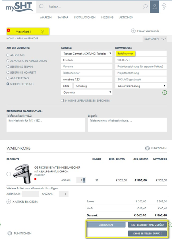 SHT Man übergibt die Artikel vom Beleg und/oder sucht sich im Webshop weitere Artikel aus Bestellnummer ist für die Bestellung zwingend erforderlich -> wird im Belegkopf als „Bauvorhaben“ eingetragen, sobald ein Artikel in den Beleg übernommen wird.