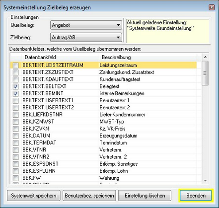 Damit Sie nicht bei jeder einzelnen Erzeugung eines Zielbeleges diese Einstellungen kontrollieren und ändern müssen, können Sie in diesen "Systemeinstellungen Zielbeleg" die von Ihnen standardmäßig gewünschten Einstellungen vornehmen und dann entweder Systemweit oder Benutzerbezogen abspeichern.