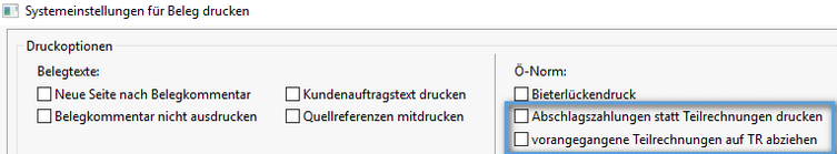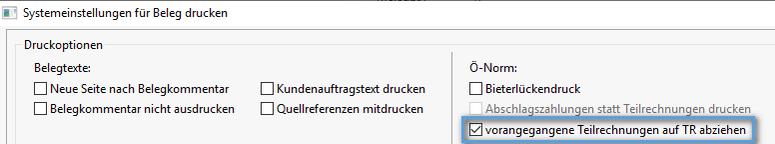 Ausdruck der kumulierten Teilrechnungen: Drucksymbol – System Einstellungen – Hakerl setzten bei „Vorangegangene Teilrechnungen auf Teilrechnung abziehen“.