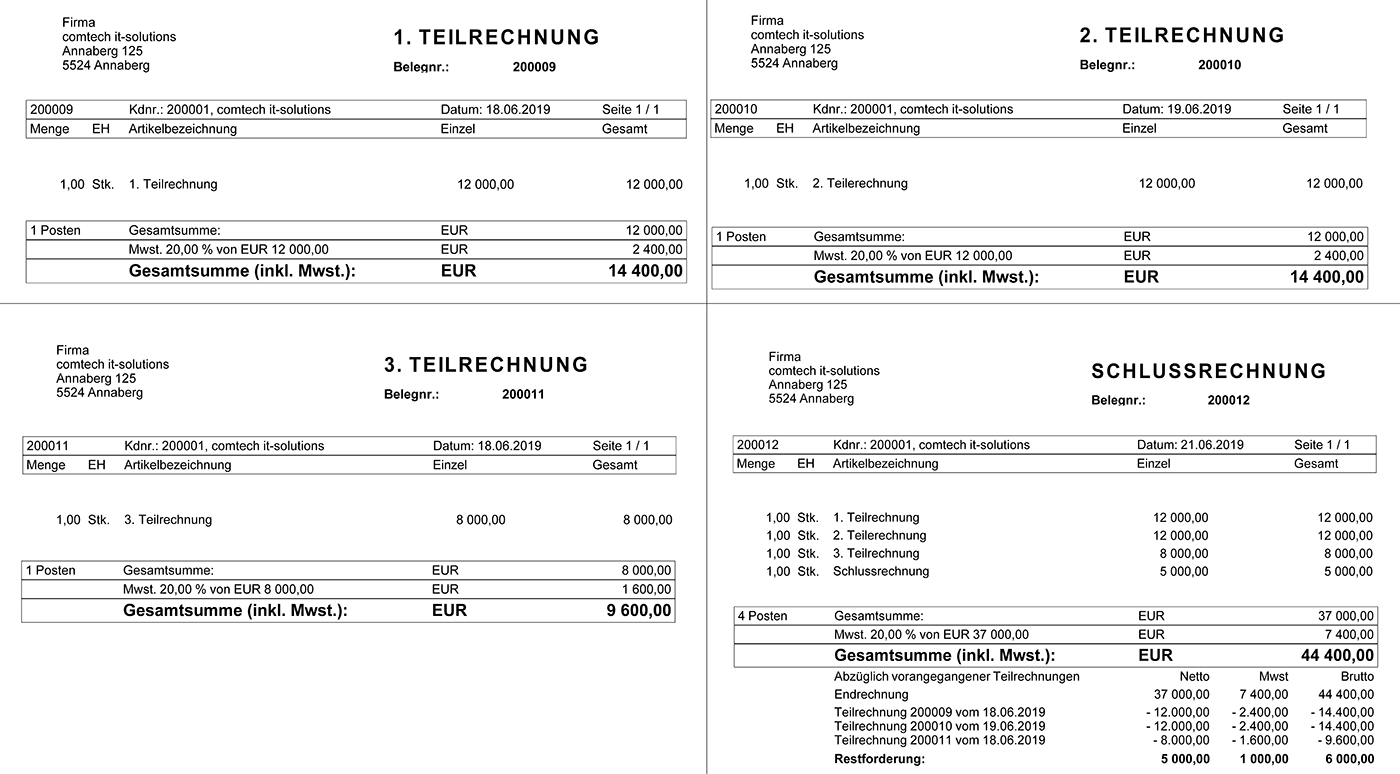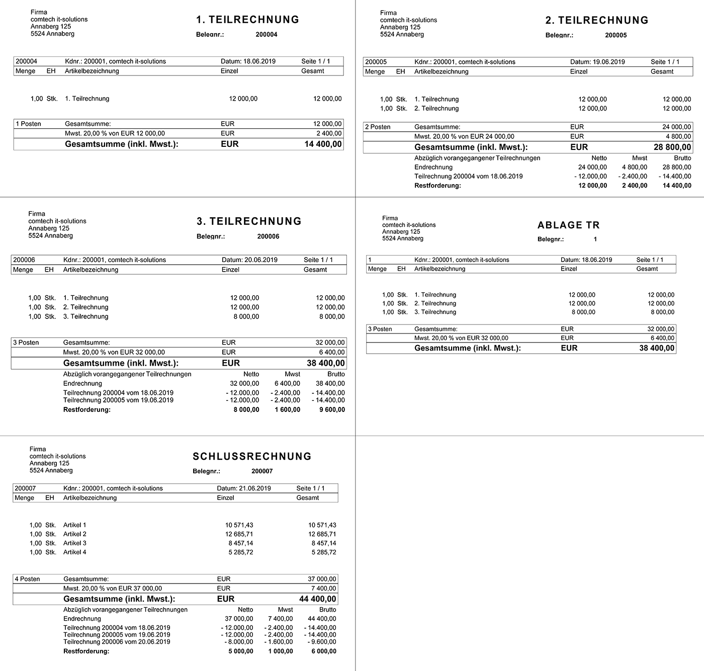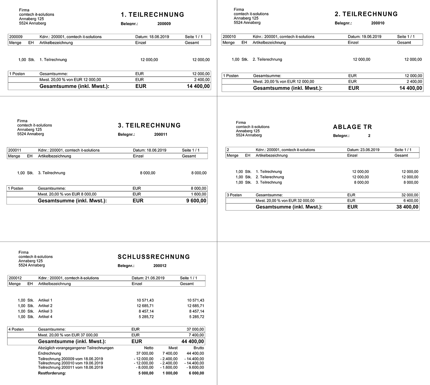Der Bereich der Teil- und Schlussrechnung ist sehr umfangreich und komplex. Bitte klären Sie Sonderfälle im Vorfeld mit unserem Support-Team!