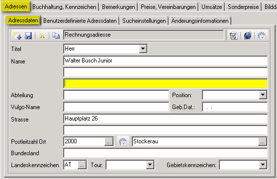 Jeder Kunde kann auch mehrere Rechnungs- und/oder Lieferadressen haben. Die jeweils zutreffende Adresse kann im Belegkopf ausgewählt werden.