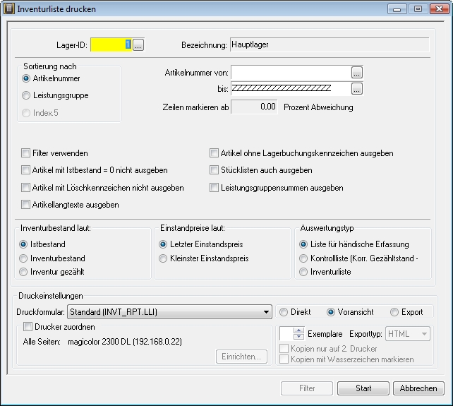 Artikel ohne Lagerbuchungskennzeichen ausgeben: es werden auch Artikel gedruckt, die in diesem Lager nicht bestandsgeführt werden.