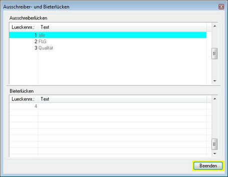In diesem Fall gibt es zu der Position zwei Ausschreiberlücken: Lückennr. 1: Arbeitsbeginn Lückennr. 2: Fertigstellungstermin