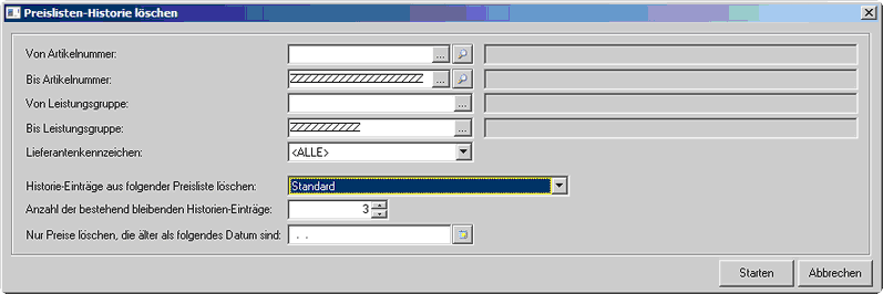 Artikelnummer von / bis Leistungsgruppe von / bis Lieferantenkennzeichen - nur einen bestimmten Lieferanten löschen (das betrifft aber nur die Historie, nicht die Artikel !) Preisliste: Standard ist die Preisliste 1 (= Standardpreisliste)