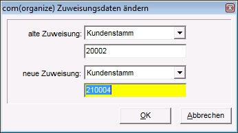 Mit dieser Funktion können Sie ALLE bisherigen Zuweisungen zu einem konkreten Kunden/Lieferanten/Kontakt  einem anderen Kunden (...) neu zuweisen. Alle Nachrichten, Dokumente usw. werden von der alten Zuweisung auf die neue Zuweisung geändert.