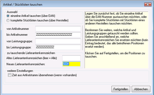 Hier können Sie grundsätzlich entscheiden, ob der Tausch nur für bestimmte Artikel („von Artikelnummer“ / „bis Artikelnummer“) oder nur für bestimmte Leistungsgruppen („von Leistungsgruppe“ / „bis Leistungsgruppe“) gemacht werden soll. Weiters müssen Sie das neue Lieferantenkennzeichen eingeben (von diesem Lieferanten werden dann die Tauschartikel bzw. Stücklisten genommen).