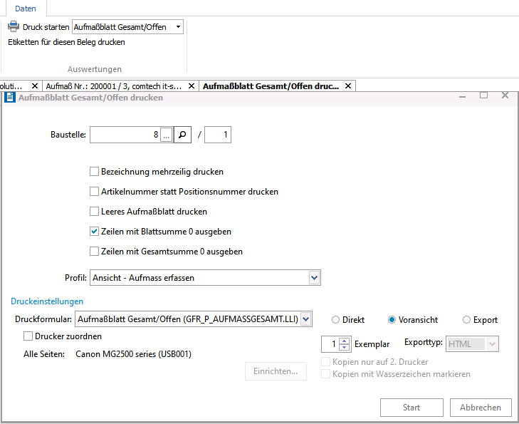 Eine Zusammenfassung der Mengen der Aufmaßblätter können Sie über den Ribbon Daten / Liste Druck starten öffnen und Aufmaßblatt Gesamt/Offen ausdrucken