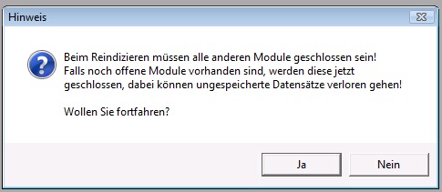 Hinweis: da beim Einspielen auch sämtliche Indizes und Suchschlüssel neu aufgebaut werden, kann das gesamte Reorganisieren/-indizieren recht lange dauern (ja nach Anzahl der vorhandenen Sätze). Während des gesamten Vorganges darf NICHT im Programm weitergearbeitet werden !