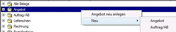 Sie können dann auswählen, ob Sie sofort einen neuen Beleg dieser Belegart anlegen wollen (im Beispiel oben ist das die Belegart "Angebot") oder Sie können zusätzlich auf "Neu" klicken und erhalten eine Liste aller auf Ihrem EDV-System verfügbaren Belegarten.