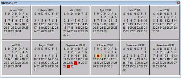 Jahr: gibt eine graphische Kurzübersicht über alle Tage des Jahres, wobei diejenigen Tage, an denen irgendein Eintrag gemacht wurde, rot hinterlegt sind: