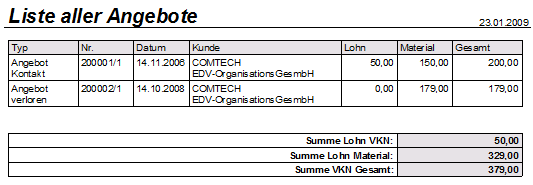 Gibt eine Liste aller Angebote sowie deren VKN Preise aus. Mit Hilfe der Einschränkungen können auch nur Angebote innerhalb eines gewissen Zeitraums ausgegeben werden.