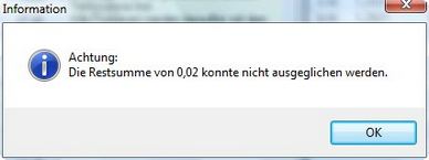 Hinweis: in manchen Fällen kommt nicht genau der von Ihnen eingetragene Betrag heraus – dies kann insbesondere dann passieren, wenn beim letzten Artikel eine Menge ungleich 1 steht: dann funktioniert der Rundungsausgleich nicht genau. Sie erhalten in diesem Fall aber eine entsprechende Information: