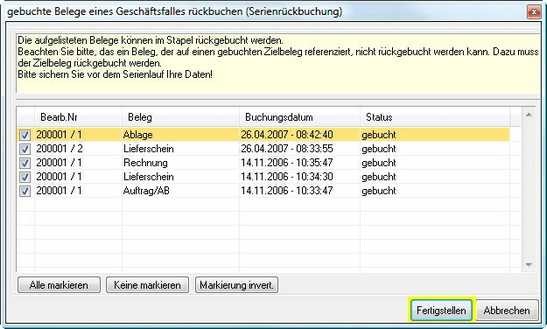 Mit Hilfe dieser Funktion können Sie mehrere (oder alle) Belege eines Geschäftsfalls rückbuchen.