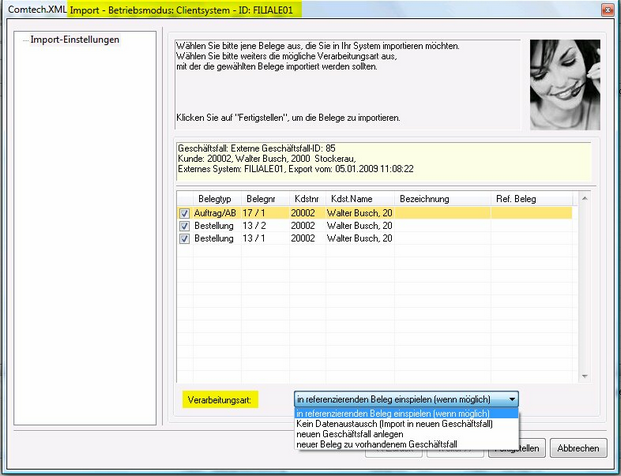 Datenabgleich: alle Stammdaten, die am Import-System bereits vorhanden sind, werden normal verwendet; alle Stammdaten, die am Import-System noch nicht vorhanden sind (Z.B. neuer Kunde, neuer Artikel, Durchlauftext) werden beim Import mit den Originalwerten des Export-Systems NEU angelegt.