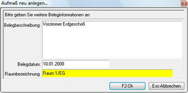 In der daraufhin erscheinenden Maske tragen Sie eine Belegbeschreibung sowie eine Raumbezeichnung ein; das Tagesdatum wird automatisch voreingestellt, kann aber verändert werden: