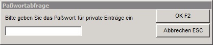 - Sie geben Ihr Passwort ein und sehen damit auch Ihre privaten Einträge - Sie brechen die Passworteingabe mit der "Esc"-Taste ab (oder geben irrtümlich ein falsches Passwort ein): in diesem Fall werden die privaten Einträge nicht angezeigt. Sie können aber nachträglich mit der "Variante 2" (--> Optionen --> Private Einträge anzeigen) die Passworteingabe wiederholen.
